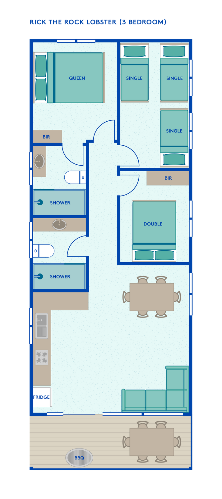 Ready for the ultimate beach house experience full of modern luxury? Rick the Rock Lobster's Three Bedroom Beach Houses are amazing for a group of 7, bringing a new level of comfort to the Park. Sit back, relax and entertain with your private deck, BBQ and outdoor setting while the kids can revel in the outdoors! With a modern, crisp, fully equipped kitchen including oven, coffee machine, and full-fledged fridge, these houses are your home away from home!
